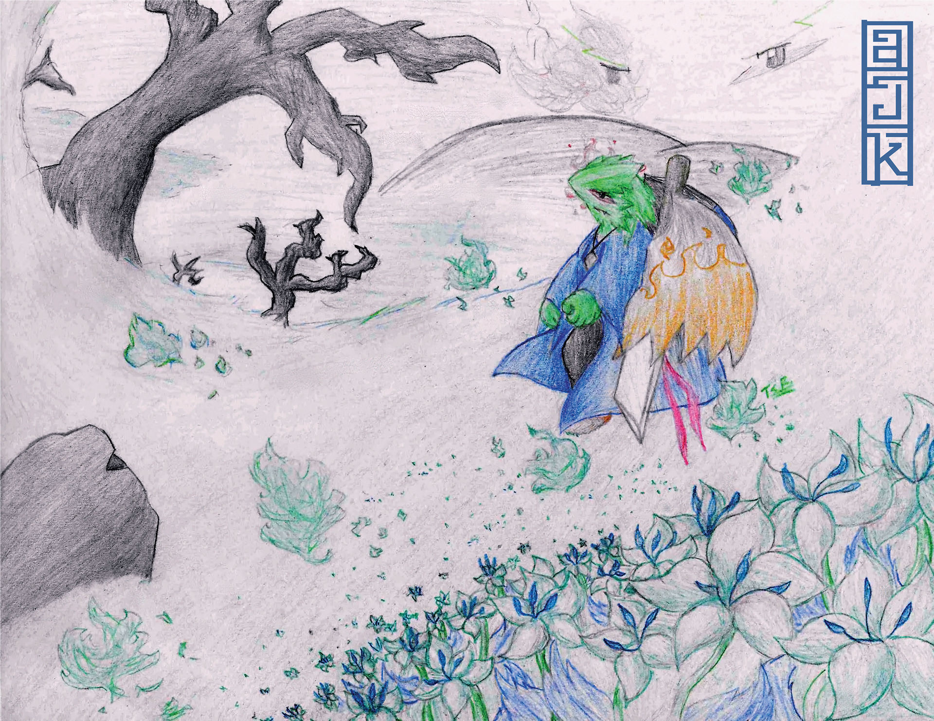 The character Tyran is heavily based off of the design of Tyranitar from the Pokémon series. In creating the concept of the drawing's location, I took some inspiration from the Twilight Realm in the video game The Legend of Zelda: Twilight Princess and the Reverse World and Gracidea fields from the movie Pokémon: Giratina and the Sky Warrior.